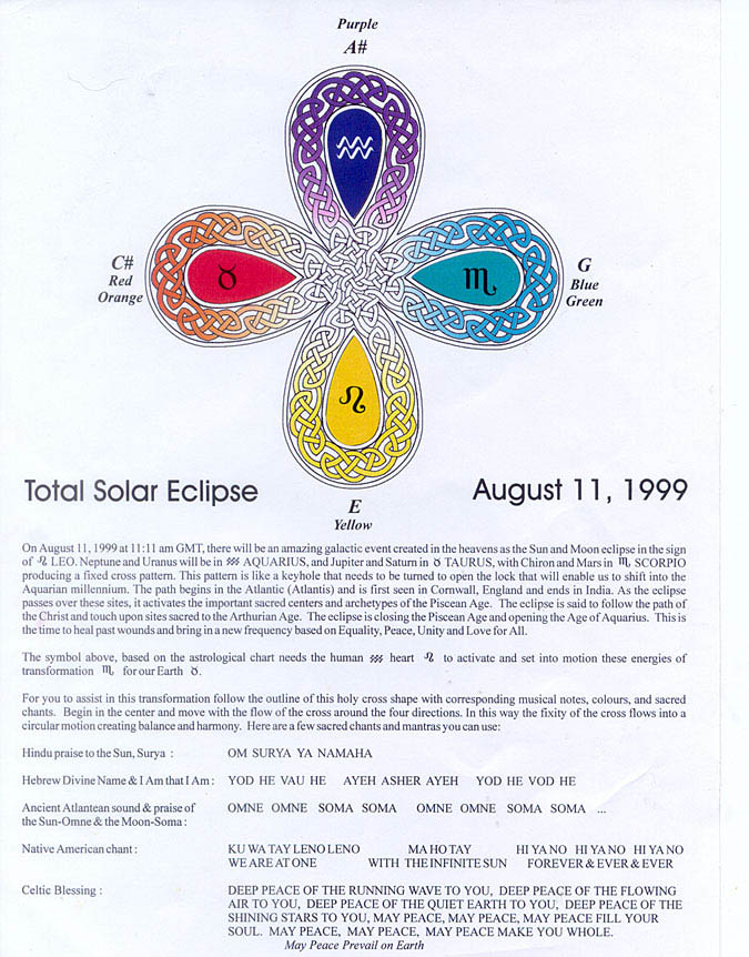 Eclipse cycles bring the dark shadow into light to catalyze global change. On August 11, 1999, the last total lunar eclipse of the millennium occured. An astrological configuration known as a Fixed Cosmic Cross pattern was created in the sky. this was created with the Sun and Moon in Leo, Neptune and Uranus in the sign of Aquarius and Jupiter and Saturn were in Taurus, with Chiron and Mars in Scorpio. This pattern was a keyhole, Love and Unity the key that was to be turned to open the lock enabling us to shift into the Aquarian millennium. The path began in the Atlantic (Atlantis) and was first seen in Cornwall, England where millions of people gathered along the path for this extraordinary event. As the eclipse passed over these sites it activated the important sacred centers and archetypes of the Piscean Age. The eclipse followed the path of the Christ, the Arthurian Grail land and touched upon sacred sites before ending its journey in the Holy land of India. This eclipse closed the Piscean Age and opened the portal for the Age of Aquarius. Since this eclipse we have been releasing the past wounds of the Piscean Age and can now bring in a new frequency and new paradigm based on Aquarian values based on Global Unity, Fellowship and Love.